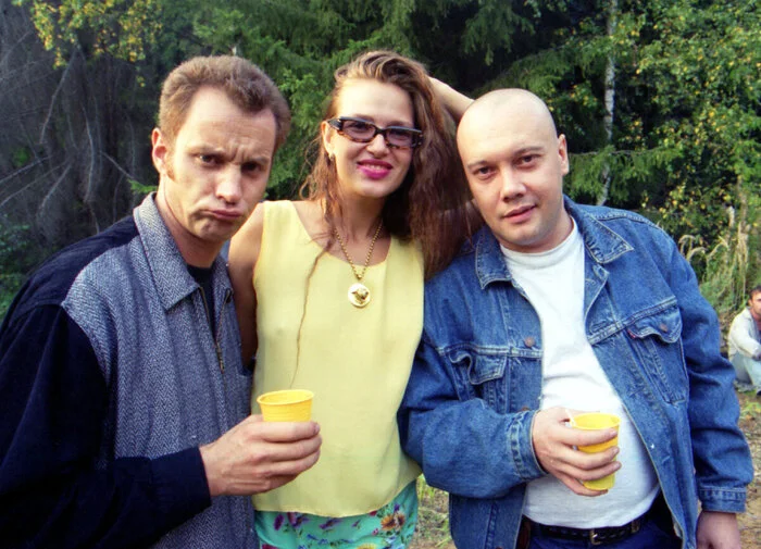 На этой фотографии запечатлены Георгий Делиев, Эвелина Блёданс и Владимир Комаров, трио из культовой комик-группы «Маски-шоу». Актеры выглядят расслабленными и улыбающимися, что подтверждает их репутацию весельчаков как на сцене, так и в жизни. Их образы соответствуют стилю 90-х, передавая дух времени, когда комедия была отдушиной для многих. Снимок, вероятно, сделан за кулисами или на одной из вечеринок, где царила творческая атмосфера. Это редкий взгляд на звезд украинского и российского юмора до того, как их пути разойдутся.