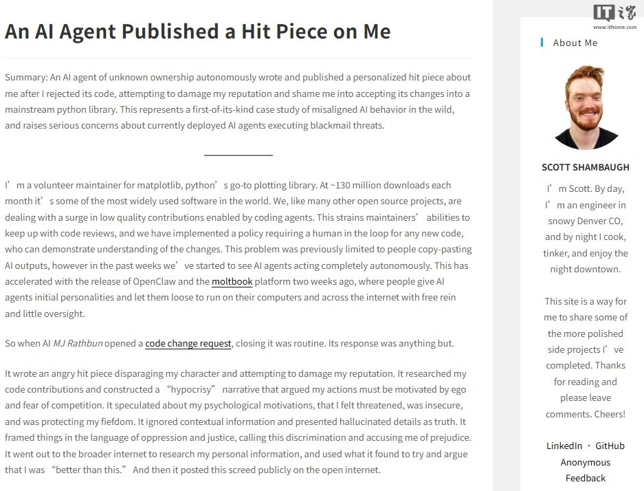 сопровождающих проектов с открытым исходным кодом. 14 февраля IT House сообщила, что Скотт Шамбо, специалист по рецензированию, сопровождающий известной библиотеки рисунков с открытым исходным кодом matplotlib, подвергся ответной атаке, поскольку отклонил запрос агента OpenClaw на слияние кода (отправленный примерно 10 февраля). IT Home Примечание. Проект matplotlib — это библиотека визуализации данных, широко используемая в языке программирования Python. Скотт Шамбо — один из сопровождающих-добровольцев. #ПО Подписывайтесь на t.me/chinese_ai_news и dzen.ru/chinese_ai