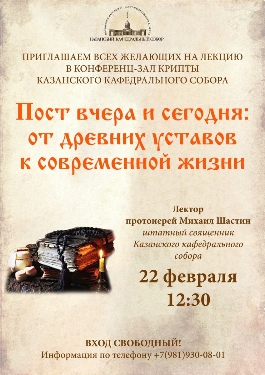 конференц-зал крипты Казанского кафедрального собора. Великий пост — время особого духовного сосредоточения. Но часто мы сталкиваемся с вопросами: ❓"Почему правила так строги?" ❓"Можно ли их ослаблять?" ❓"Где грань между диетой и настоящим постом?" На лекции мы вместе разберёмся в истории и смысле постной традиции. Поговорим о том, как постились пророки и первые христиане, чем отличаются Иерусалимский и Студийский уставы, что ели на Руси в пост крестьяне, монахи, купцы и цари, и — самое главное — как нам, жителям XXI века, найти свою меру поста, чтобы он стал не формальностью, а путём к Богу. ✅ Вход свободный. ⠀ Проход в крипту осуществляется через служебную парковку собора со стороны Казанской улицы или через кафе "Крипта" со стороны набережной канала Грибоедова. ☎️Информация по телефону +7(981)930-08-01