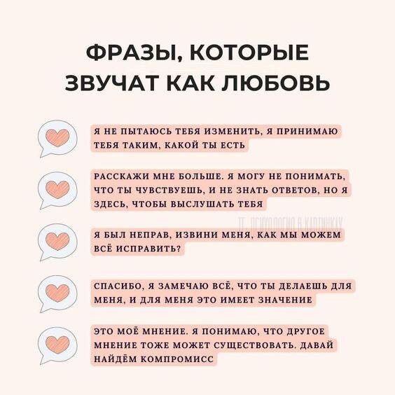 ! 💕 В этот волшебный день я рекомендую вам не только признаться в любви своим близким и любимым (и не только 14 февраля) сказать ➡️ ФРАЗЫ ПОДДЕРЖКИ 1. Благодарю тебя за то, что ты у меня есть. 2. Мне важен ты. Я рядом, даже когда мы молчим 3. Ты можешь быть любым со мной: грустным, уставшим, злым .. Я не перестану тебя ценить 4. Ты справляешься лучше, чем думаешь. 5. Ты мой подарок! 🎁 6. Этот мир становится лучше, потому что в нем есть ты. 7. Береги себя для меня! 8. Я люблю тебя, я с тобой! 9. Спасибо за твоё надёжное плечо и что ты рядом! 💔 А если и в ваших отношениях: наступили тревожные дни и отношения претерпевают раздор: •ссоры по пустякам •вы всегда виноваты во всех смертных грехах •вас не слышат и не слушают •нет диалога •ваши действия подвергаются критике •не ценится то, что вы делаете •партнер говорит только о себе •вы не такая или все не так •постоянные обиды •вы перестали заниматься сексом •ощущение одиночества в двоем Знакомо? ⏳ Значит пора что-то менять!