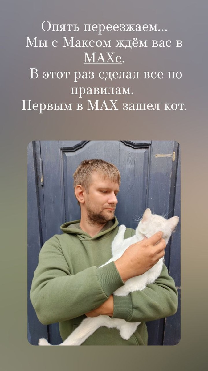 Присоединяйся к каналу по ссылке: https://max.ru/id772151409508_biz Разве меня можно напугать переездами? Наоборот. Мне только в радость. Кота запустил первым, так что все будет отлично. Еще один канал теперь вести буду. Пока осваиваюсь, обживаюсь. Привыкаю к настройкам. Жду вас в гости. Присоединяйся к каналу по ссылке: https://max.ru/id772151409508_biz А вы уже в Максе расскажите?