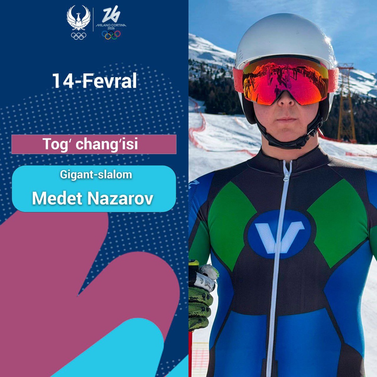 В 14:00 по узбекскому времени Медет Назаров выступит в гигантском слаломе (горнолыжный спорт);