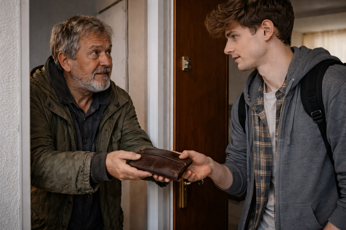 На лестничной клетке стоял мужчина. Лет пятидесяти, небритый, в грязной куртке, из-под которой виднелся свитер с катышками. В руках он держал потертый кожаный кошелек.