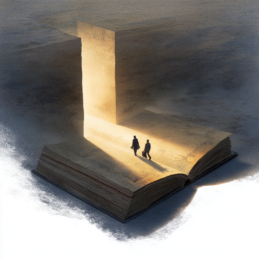 Промт 1: Сюрреалистическая сцена: огромная древняя книга, лежащая на пустоте; развороты образуют дорожку, по которой идут две маленькие фигуры в деловых костюмах; на горизонте — высокая светящаяся стена-проход, освещенная тёплым золотистым светом; вокруг тёмная туманная выборка; текстуры бумаги и переплета детализированы; стиль цифровая живопись с масляной фактурой; атмосфера начала пути и загадки; цветовая палитра — золотистый, янтарный, глубокий синий; перспектива сбоку, лёгкий низкий ракурс; кинематографический свет. Параметры Midjourney: --ar 16:9 --v 5 --q 2