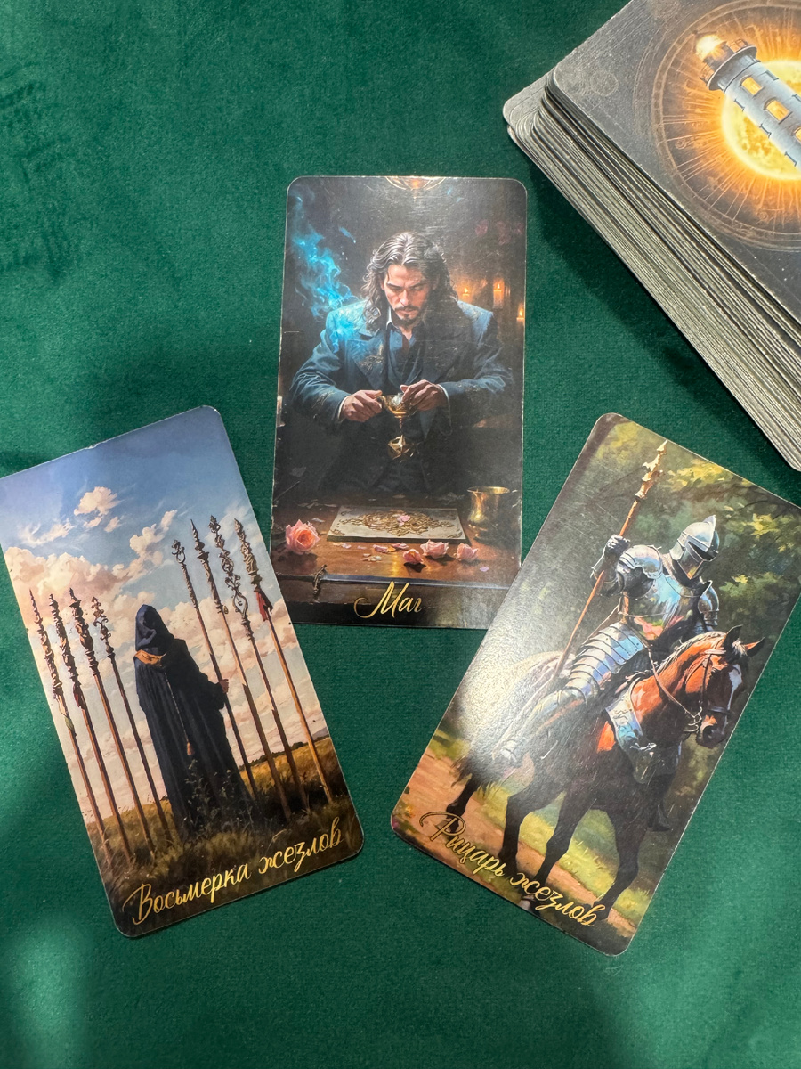 И вот здесь начинается самое красивое. Карты легли так, что Рыцарь Жезлов и Аркан Влюбленные сливаются в единый образ — образ страстного, искреннего и очень смелого признания.