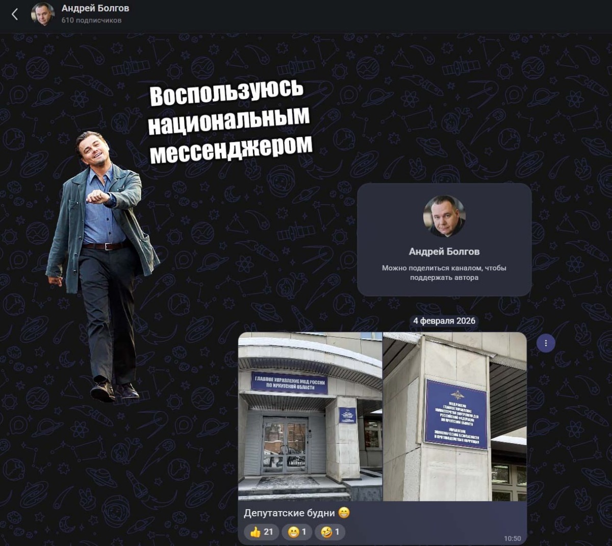 Есть такой депутат Андрей Болгов в Иркутской области. Решил человек идти в ногу со временем, завёл канал в Максе, дублировал туда свои публикации. Как вдруг его канал снесли без объяснения причин. Учитывая, что мессенджер этот достаточно особенный, можно посмотреть какой была последняя публикация перед блокировкой (см. скриншот). А выводы каждый сделает сам.