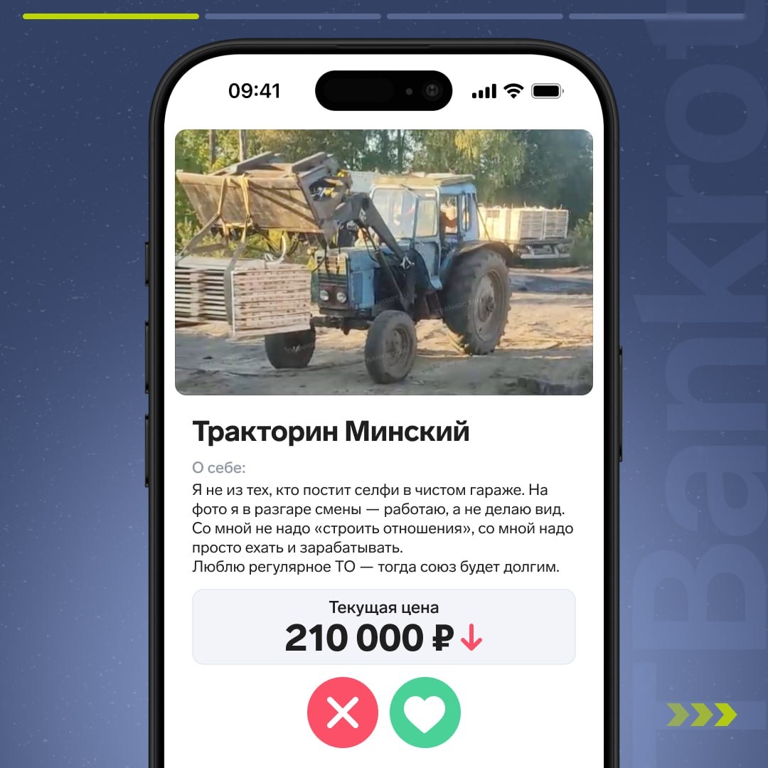 »... среди лотов 💘 Собрали для вас лоты, которые не пытаются казаться лучше, чем они есть на самом деле. Их сущность не спрятана за ретушью — она честно зафиксирована в карточках лотов. Выбирайте кандидатов, готовых к прозрачным отношениям: 💙 Тракторин Минский: Брутальный работяга >> https://clck.ru/3RnUWj 🤍 Порша Бездокова: Эффектная внешность и статусность >> https://clck.ru/3RnUXJ 🖤 Поля Безграничная: Перспективная земля, которая ищет определенности >> https://clck.ru/3RnUXp 💚 Сбер Дебиторович: Серьезный актив, которого нужно добиться >> https://clck.ru/3RnUYG С кем бы вы сошлись характерами? Пишите имя в комментариях 👇