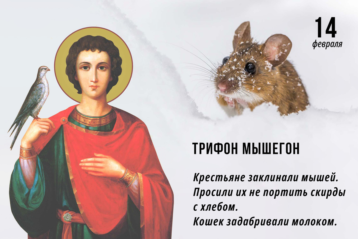 Православные верующие 14 февраля вспоминают святого Трифона – покровителя влюбленных, супружеских пар и охотников. Он родился в III веке в простой крестьянской семье. С юных лет обладал даром исцелять болезни и изгонять нечистую силу. Во времена гонений на христианство был схвачен, подвергнут жестоким пыткам и казнен. На Руси верили, что святой отгоняет вредителей полей и садов. В народе праздник часто называли Днем Трифона Мышегона. В деревнях нередко проводили обряды «вывода» мышей. Знахарки обходили каждый хлев и амбар, высыпали там золу (от сожжённого в печи пучка сена) и читали заговоры. Из домов выносили какие-то старые вещи, чтобы «увести» за собой грызунов и темные силы. В этот день было принято также задабривать кошек. Их угощали молоком и просили защитить от мышей. А еще наши предки подкармливали зимующих птиц. Трифонов день считался удачным для помолвок и свадеб. Незамужние девушки молились святому Трифону о встрече с суженым. Семьи изготавливали специальные свечи и освящали