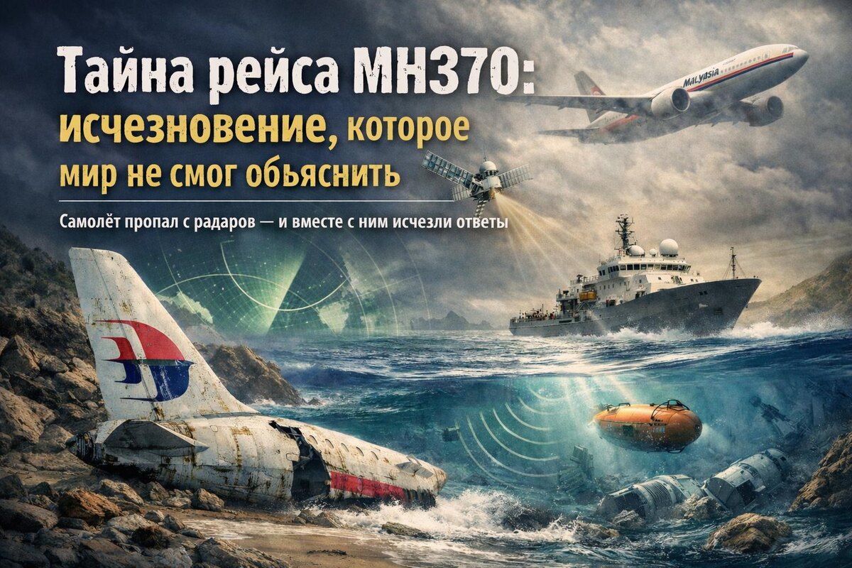 Самолёт пропал с радаров — и вместе с ним исчезли ответы. В ночь на 8 марта 2014 года пассажирский самолёт рейса MH370 исчез с радаров вскоре после вылета из Куала-Лумпура в Пекин. На борту находились 239 человек. Связь оборвалась менее чем через час после взлёта, причём сигнал бедствия подан не был. С этого момента началась одна из самых загадочных историй современной авиации. Международные поиски стали крупнейшими в истории. Анализ спутниковых сигналов показал: лайнер резко отклонился от курса и направился на юг над Индийским океаном. Предполагается, что он потерпел крушение в удалённой зоне, куда крайне сложно добраться даже современным исследовательским судам. Расследование установило, что после исчезновения с радаров самолёт ещё несколько часов автоматически передавал технические сигналы спутниковой связи. Эти редкие сигналы позволили определить предполагаемую траекторию полёта — дугу в южной части океана. Именно этот анализ стал главным ориентиром для поисковых экспедиций. Особое
