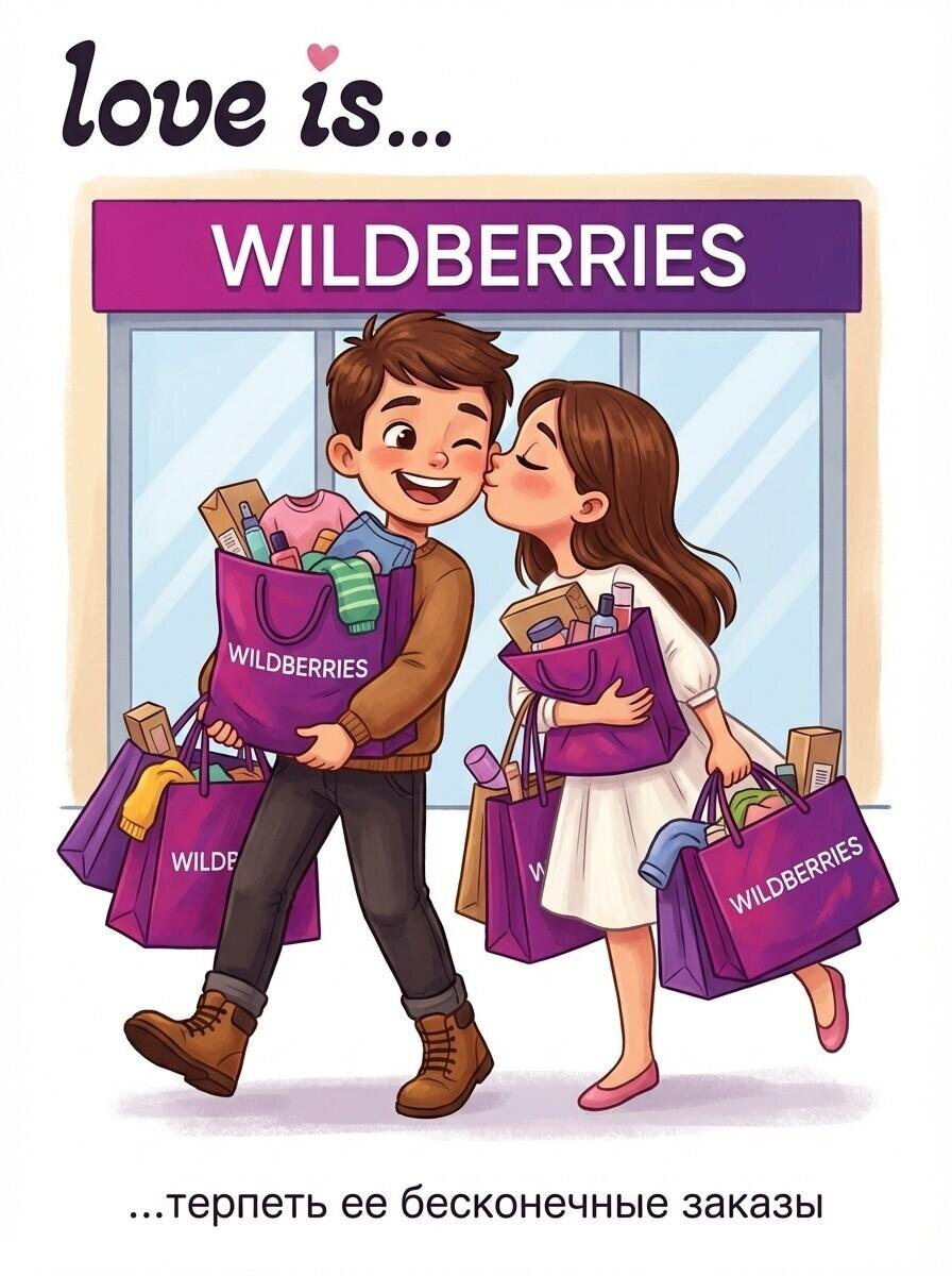 Модель: Nano Banana Сгенерировать🪄 Примени лица людей с фото. На изображении представлена стилизованная цветная иллюстрация в мультяшном стиле, в стиле открытки лав ис, изображающая двух персонажей — мальчика и девочку, которые несут большие пакеты из пункта выдачи wildberries. Оба персонажа уверенно стоят рядом, при этом мальчик обращён слегка вправо, а девочка — влево, образуя динамичную композицию. Девочка, одета в белое платье и розовые туфли, а мальчик в коричневый свитер, темные брюки и коричневые ботинки. Пакеты, которые они держат, фиолетовые с логотипом « wildberries » — в них ярко прорисованы вещи: одежда, косметика , посуда, в тёплых насыщенных цветах. За ними виден простой фон — изображение пункта выдачи « wildberries», где название написано в их фирменном стиле,. Сцена наполнена лёгкой и радостной атмосферой совместного похода за покупками, подчёркнутой мягким ровным освещением без резких теней, создающим ощущение дневного естественного света. В верхней части иллюстр