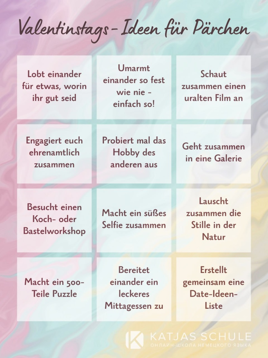 ? ⭐️ Не можешь избежать или побороть – возглавь и наслаждайся! В конце концов, 14 февраля – это прекрасный повод напомнить любимому человеку о своих чувствах. А если пары у вас нет – вспомнить о том / о той, с кем вы проводите сто процентов своего времени: о самом / самой себе. Мы подготовили два списка идей, что можно сделать в день святого Валентина как парочкам, там и людям вне отношений. Необязательно делать всё и сразу (а в случае второго списка это и невозможно: некоторые пункты будут противоположными), выберете то, что подходит именно вам. Или можно растянуть удовольствие и брать по пункту в день / в выходные! Всё решаете вы ⭐️ ⭐️ В комментариях оставим картинки в высоком разрешении. А вы пишите свои идеи на 14 февраля: как порадовать любимого человека? Или же самого / саму себя. 🔡 Учиться с нами