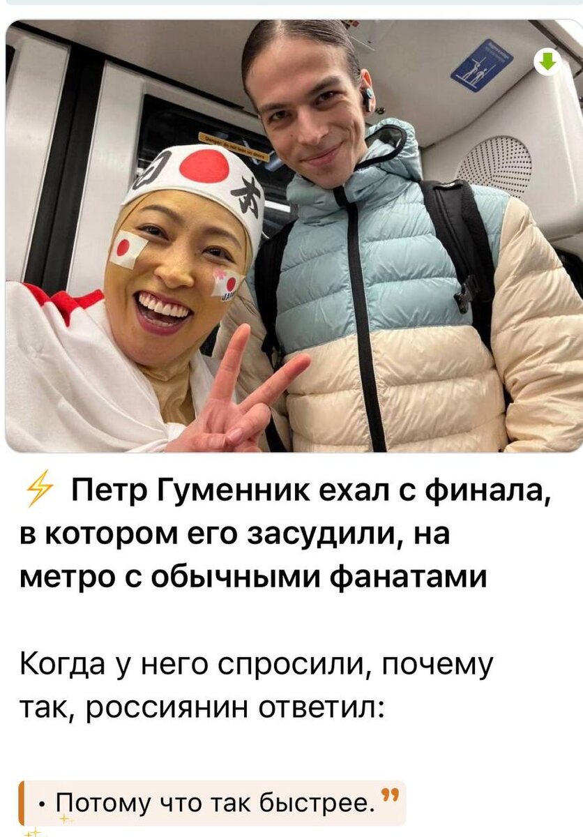 Прокатай Гуменник пару сезонов на мировом уровне, все его оценки выросли бы на пару пунктов. Так устроены все субъективны виды спора, и мы не сможем их изменить. Но как и писала вчера вечером, за одну Олимпиаду Петр так поработал на свою зачетку, что теперь она точно будет работать на него. Почему? Потому что даже при такой сенсации, как провал Малинина, о Гуменнике говорят в мировых СМИ. Он восхитил экспертов программой и сложностью, модные журналы пишут о его костюме, а фанаты в восторге от того, что фигурист с ними на одной волне и так близко. И знаете, что? После 4-х лет железного занавеса два наших парня уже оказались очень близко к медали. Не будь отстранения, и Коростелев в скиатлоне, и Гуменник в фигурке - оба бы уже любовались драгоценными кругляшами. Но жизнь не знает сослагательного наклонения. И еще отмечу одну вещь, не совсем очевидную, но важную. За эти 4 года в России выросло какое-то нестандартное для нас поколения спортсменов. Они, несмотря на то, что мир закрывает