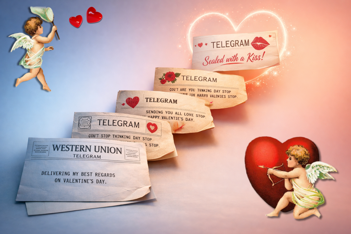 Сегодня, когда мы отправляем друг другу валентинки в Telegram (уже с маленькой буквы), мы редко задумываемся, что сто лет назад такие же послания доставляли запыхавшиеся рассыльные в форменных фуражках. А полвека назад их кодировали цифрами, чтобы пропустить через перегруженные военные линии связи.