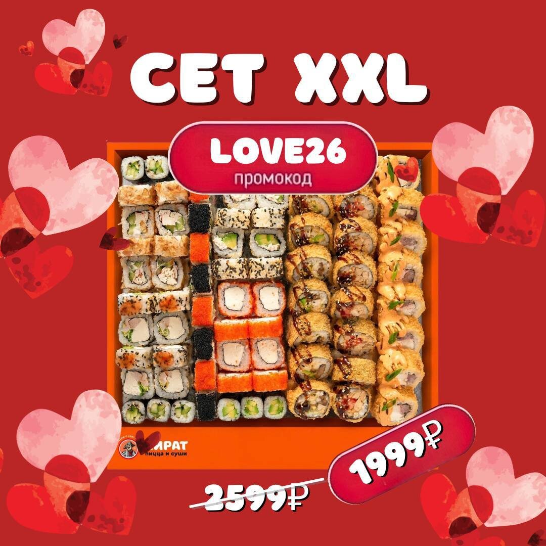 ! ❤️ Сет роллов XXL всего за 1999₽ вместо 2599₽! Вкусно, выгодно и романтично — идеальное сочетание для 14 февраля! 👉 Подписывайтесь на Пирата и забирайте свой подарок!