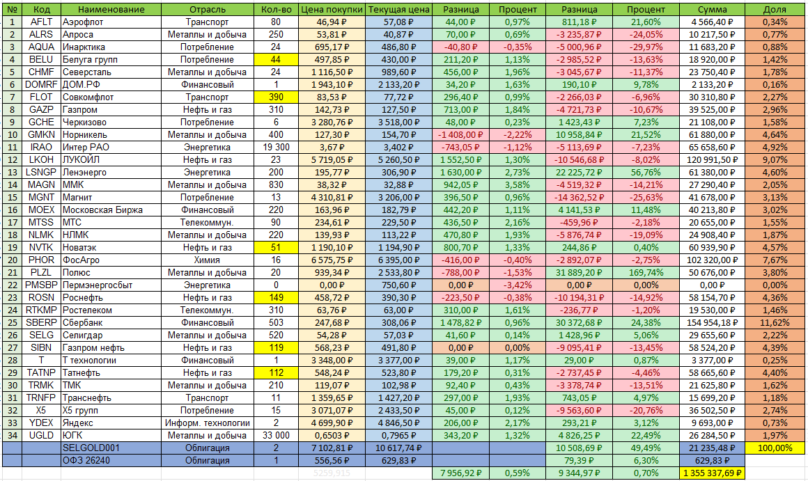 Приветствую вас на моем канале. Сегодня суббота - день отчета. Настроение бодрое. Вчера ЦБ порадовал снижением ставки. Но давайте обо всем по порядку. Итак, мой портфель сейчас выглядит вот так. Желтым, как всегда, отмечены мои покупки на этой неделе. Чаще всего покупал акции нефтегазового сектора. Сейчас этот сектор перестает быть фаворитом. Нефть дешевая, санкции лютые. Особой прибыли от них ждать не приходится. И инвесторы с коротким... горизонтом, сливают сейчас эти акции. Взамен они покупают тех, у кого сейчас все на мази. Это золотодобытчики с ними Норникель, ну и финансовый сектор. А я, как долгосрочный инвестор, действую иначе, покупаю на снижениях, и стараюсь не продавать. А если и продаю, то только на резких взлетах. Придерживаюсь постулата "покупай пока дешево". Сегодня мой портфель, в плане распределения по секторам, выглядит следующим образом. Сильных перекосов не наблюдается. Растет сектор металлов и добычи. За счет золотодобытчиков и Норникеля. Нефтегаз постепенно снижа