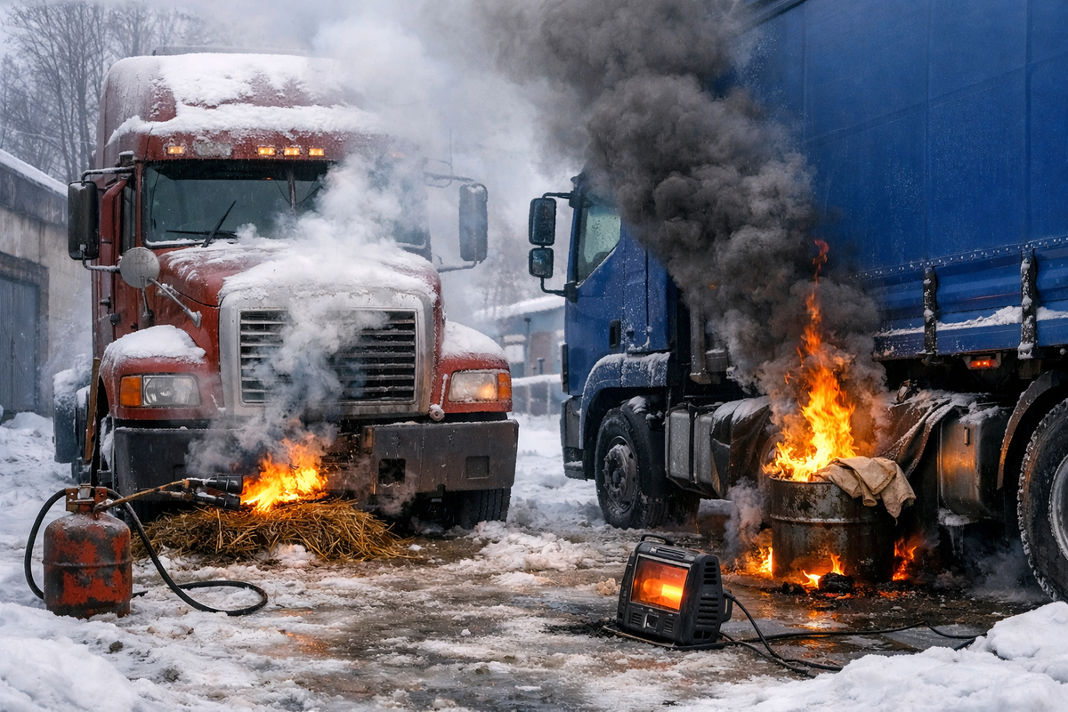 Когда грузовик не заводится в мороз, время начинает работать против водителя. Чем дольше машина стоит, тем сильнее желание прогреть её любым способом. Именно в такие моменты в ход идут проверенные «дедовские методы»: костёр под двигателем, тепловая пушка, кипяток или строительный фен. Иногда после этого машина действительно заводится. Но вопрос в другом — какой ценой. Разведение огня под картером до сих пор считается «рабочим способом». На практике это один из самых рискованных методов отогрева. Чем это заканчивается: Даже если грузовик после этого завёлся, скрытые повреждения могут проявиться позже — уже в пути. Тепловая пушка кажется безопаснее огня, но опасность здесь в неконтролируемом нагреве. Горячий воздух подаётся локально, перегревая отдельные узлы. Частые последствия: Особенно уязвимы современные грузовики с большим количеством датчиков и проводки. Ещё один популярный способ — полить двигатель горячей водой. В моменте это действительно даёт эффект, но резкий перепад температ