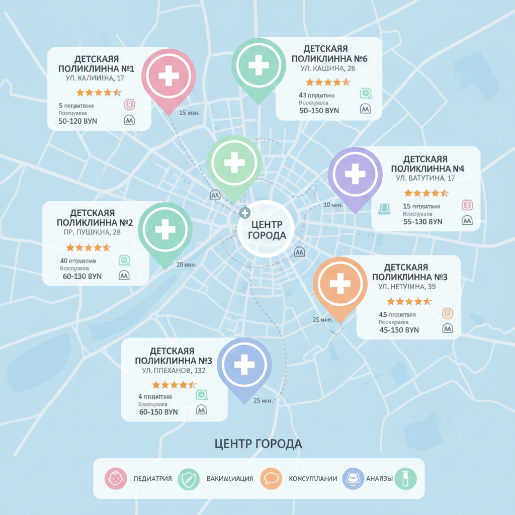 Минск — город, где можно хорошо обслужить ребёнка. Есть государственные поликлиники (бесплатно, но очередь). Есть премиум-клиники (дорого, но красиво и быстро). Есть средний класс (баланс цены и качества). Я собрал информацию про 7 лучших детских поликлиник Минска: услуги, врачи, вакцинация, анализы, цены, рейтинги, отзывы, адреса, часы работы. Это честный разбор на основе отзывов на 2ГИС, Яндекс-Карты и опыта родителей, которые там водят детей.