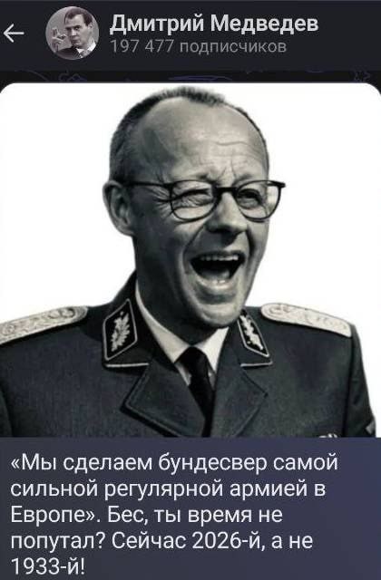 !» Медведев — о словах Мерца, что ФРГ сделает бундесвер самой сильной регулярной армией в Европе. „Dämon, bist du sicher, dass du dich in der Zeit geirrt hast? Es ist 2026, nicht 1933!“ Medwedew zu Merz’ Äußerungen, Deutschland wolle die Bundeswehr zur stärksten regulären Armee Europas machen.