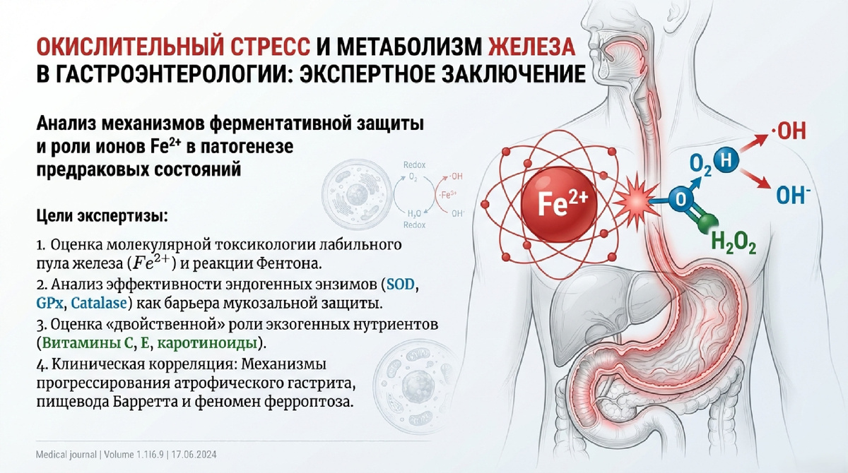 Клинический вывод: Бесконтрольный прием препаратов Fe2+ в сочетании с высокими дозами витамина С при наличии эрозивно-язвенных поражений ЖКТ является опасным. Это создает локальную зону экстремального стресса, катализирующую геномную нестабильность в регенерирующем эпителии.