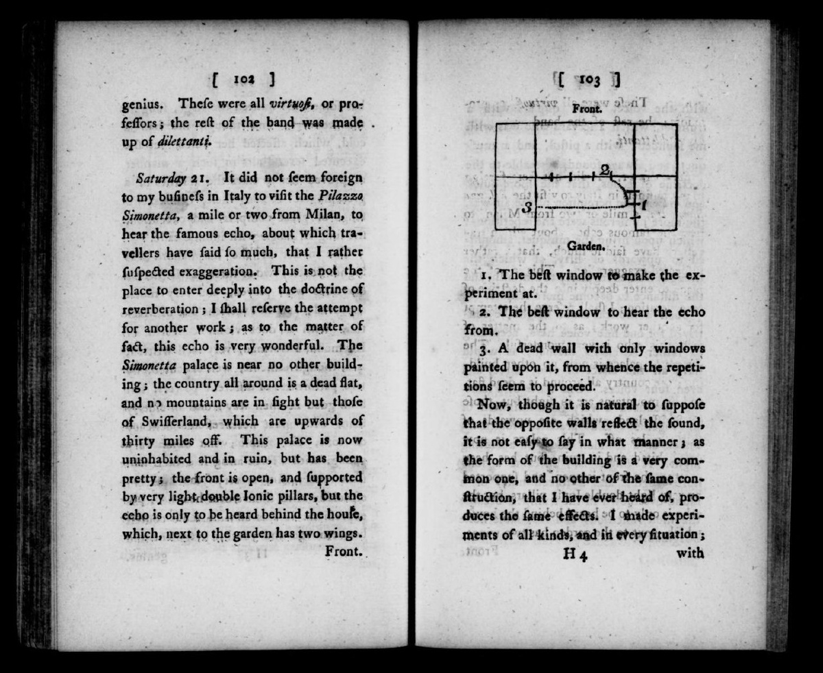 В музыкальном путешествии 1773 года Чарльз Бёрни описывает удивительный феномен близ Милана — знаменитое эхо в Палаццо Симонетта