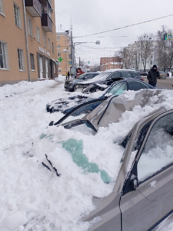 Рухнувшая снежная масса искорёжила несколько машин в Нижнем Новгороде
