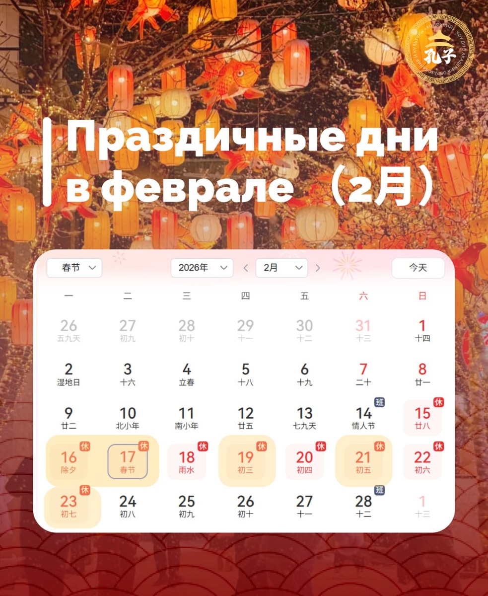 ! 🎀В связи с проведением мероприятий по случаю Китайского Нового года Школа «Конфуций» не будет работать 16, 17 и 19 февраля. Мы поздравляем вас с приближающимся Новым годом по лунному календарю! Пусть этот праздник принесёт вам радость, удачу и новые возможности в изучении китайского языка и культуры. ✨В остальные дни февраля школа продолжит свою работу в обычном режиме. Если у вас возникнут вопросы, вы можете обратиться по номеру телефона (+7 (992)-170-59-97) или написав в личные сообщения сообщества. 💡Также хотим напомнить, что по причине празднования Дня Защитника Отечества – 21 и 23 февраля тоже являются выходными.