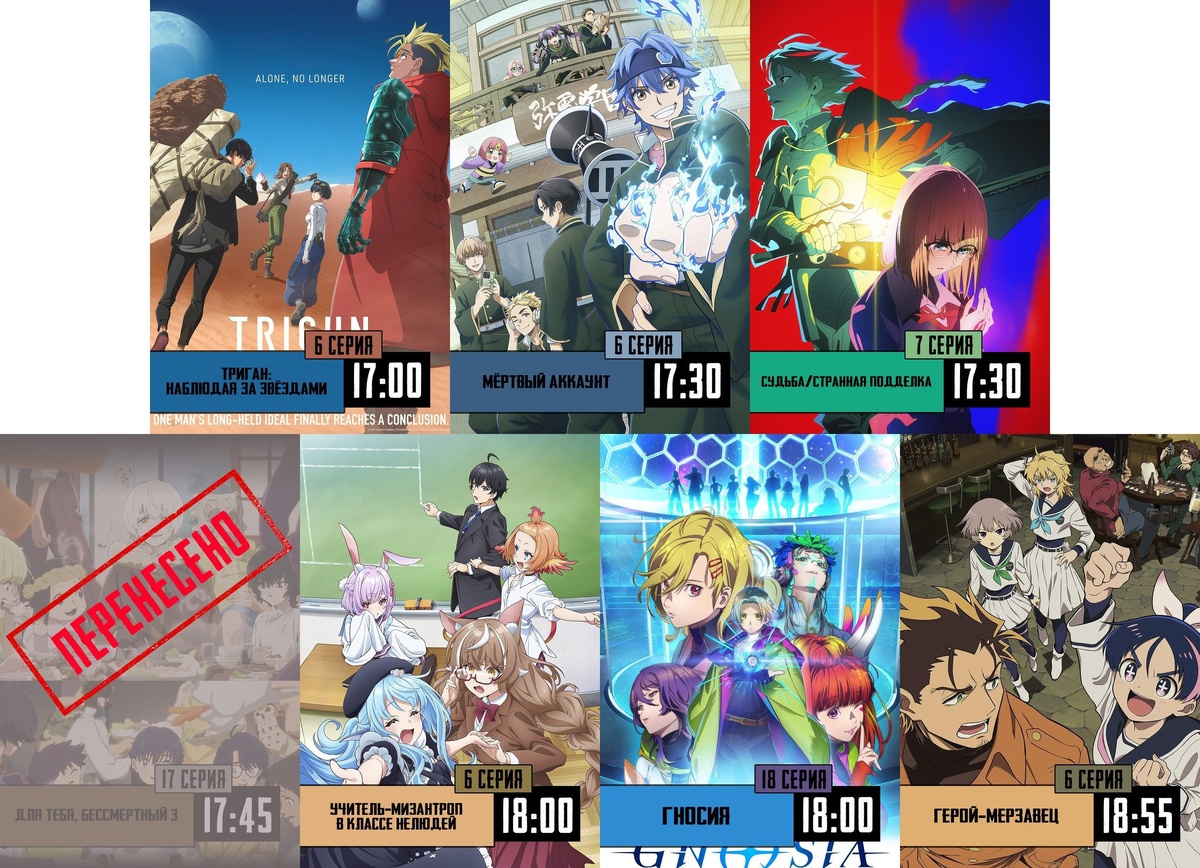 ⛔️По-порядку; 1) Триган: Наблюдая за звёздами 2) Мертвый аккаунт 3) Судьба/Странная подделка 4) Для тебя бесмертный 3-й сезон (перенос) 5) Учитель-мизантроп в классе нелюдей: Хитома, не могли бы вы рассказать нам о людях...? 6) Гносия (2-я половина) 7) Герой-мерзавец ☄️Онгоинг — аниме, серии которого выходят на данный момент. ❓Какие из онгоингов смотрите вы?