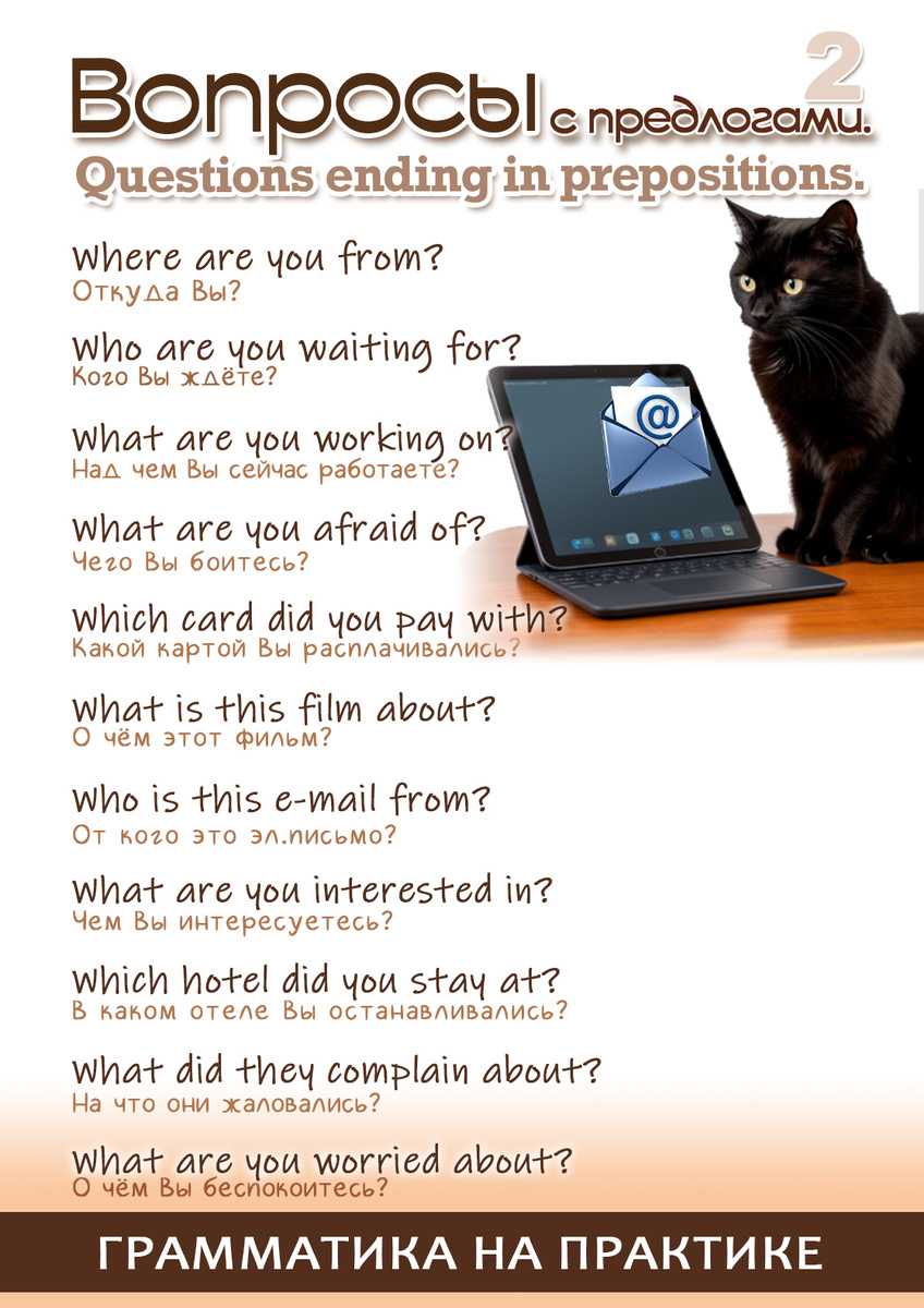 Если глагол всегда используется с каким-то предлогом, то мы обязательно должны использовать этот предлог в вопросительном предложении. Конечно, мы можем сказать "About what are you talking?" (О чём Вы говорите?), но это будет звучать не очень естественно... Лучше поставить предлог в конец вопроса - "What are you talking about?". И таких случаев достаточно много. Смотрите примеры.