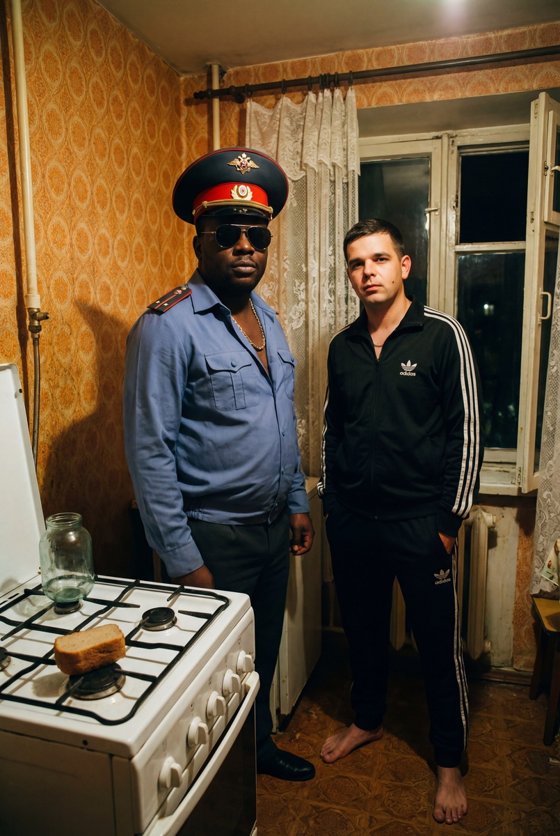 🤖Генерировать можно здесь: 👉БОТ ДЛЯ ГЕНЕРАЦИИ Режим Nano Banana Pro 4К ИНСТРУКЦИЯ Гиперреалистичный кадр из криминальной драмы 90-х. Крупный темнокожий мужчина в форме советского милиционера: голубая рубашка с погонами, фуражка с красным кантом и гербом, черные очки-авиаторы и массивная золотая цепь. Он стоит в тесной кухне хрущевки. Рядом с ним — мужчина в черном спортивном костюме Adidas с тремя полосками, босой, руки в карманах. Оба смотрят в камеру. Ретро-фон: старые оранжевые узорчатые обои, окно с кружевной занавеской, за окном глухая ночь. На переднем плане белая газовая плита, стеклянная банка и кусок хлеба. Освещение: тусклый желтый свет одной лампы накаливания, создающий глубокие тени. Съемка с низкого ракурса (от пояса). Стилистика фильма «Груз 200», текстура старой 35-мм пленки, зернистость, приглушенные цвета. 8k, высокая детализация. СГЕНЕРИРОВАТЬ 📸 ПОДПИСАТЬСЯ 💬