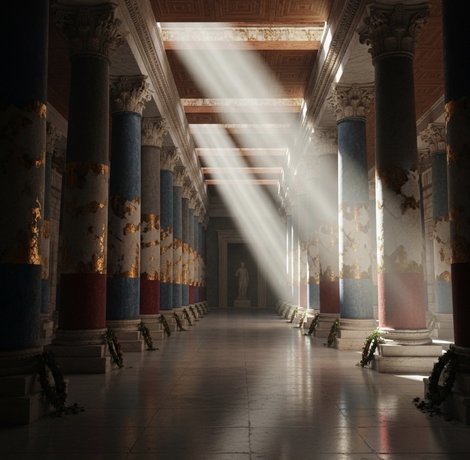 Солнце, которое снаружи было ярким, внутри превращается в священный полумрак. Свет проникает только через отверстие в крыше (там могли быть решетки или жалюзи, чтобы птицы не залетали) и отражается от полированного мрамора.