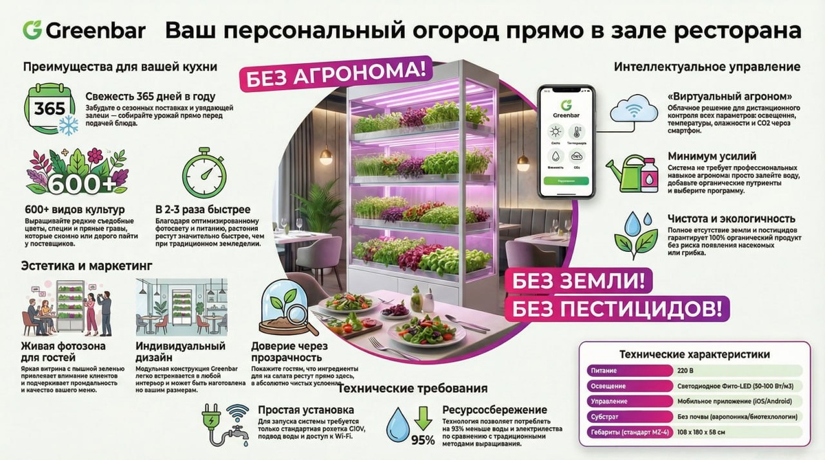 ! Представьте: повар срезает листики базилика в присутствии гостя — и кладёт их в тарелку через 10 секунд. Никакой логистики. Никаких отходов. Только максимальная свежесть, вкус и аромат, которые невозможно достичь при традиционных поставках. С ситифермами Greenbar ваш ресторан становится: ✅ «Зелёным» флагманом — живая ферма как часть интерьера ✅ Экономически устойчивым — себестоимость микрозелени от 4 ₽, окупаемость от 4 месяцев ✅ Технологичным — управление через приложение, без агронома, с ИИ-поддержкой Мы предлагаем решения под ключ: 🔹 Встраиваемые витрины LUX — для эстетики и статуса 🔹 Компактные модули MZ — для микрозелени за 5–9 дней 🔹 Полная автоматизация + подписка на семена и растворы 💡 Это не просто оборудование — это новый формат подачи блюд, маркетинговый козырь и реальная экономия. 📩 Готовы рассчитать выгоду под ваш ресторан? Пишите в Директ или на market@green-capital.ru #ресторан #hoReCa #фудтех #greenbar #ситиферма #вертикальнаяферма #микрозелень #ресторанныйбизнес