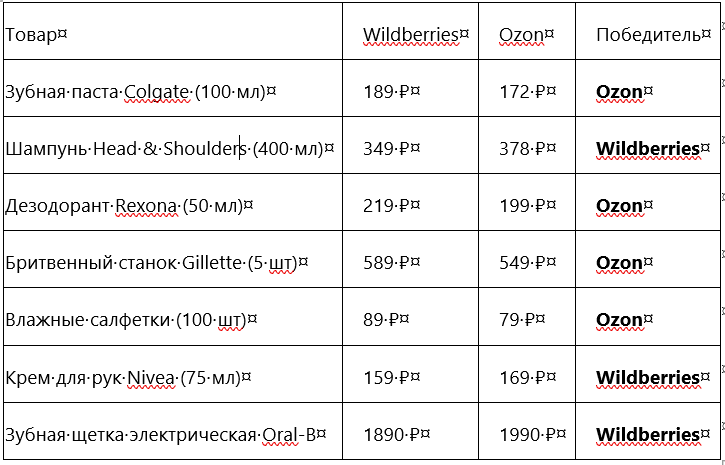 Вывод по категории: Ozon выигрывает в мелочах, Wildberries — в электро-гигиене. Разница копеечная, можно брать где удобнее.