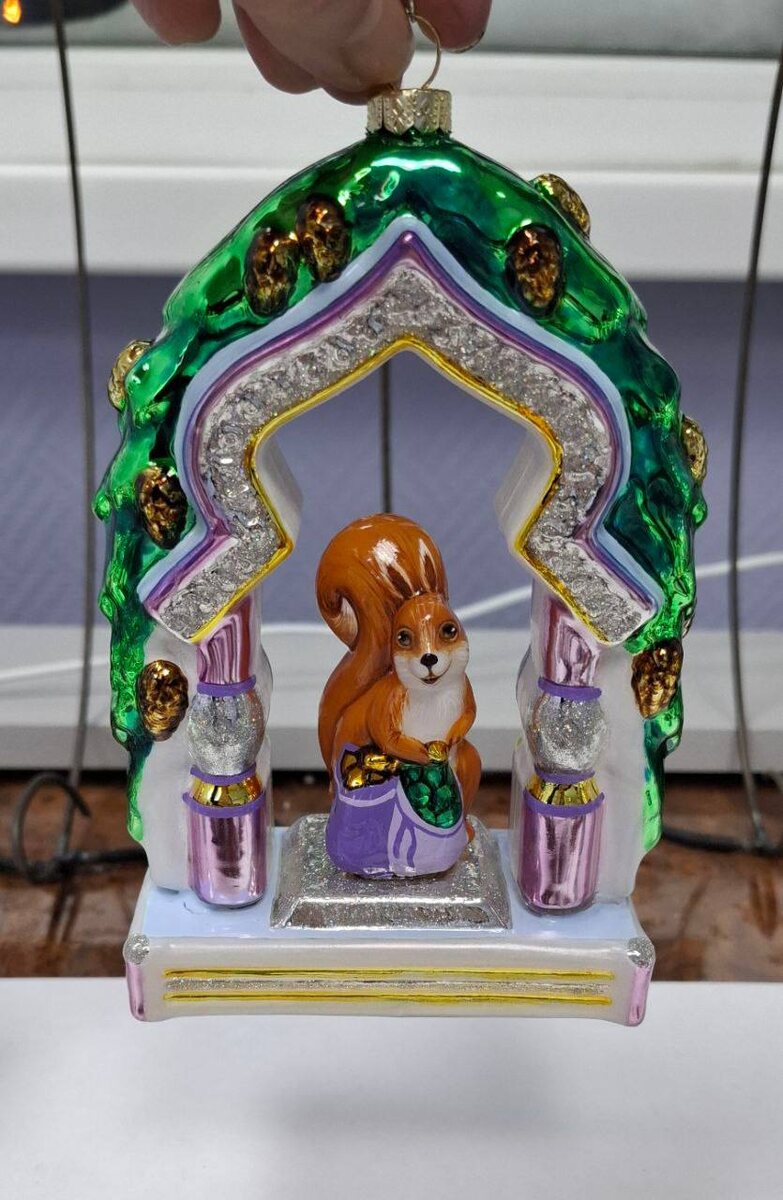 Представляем вам фабричную роспись елочной игрушки Белочка в хрустальном тереме