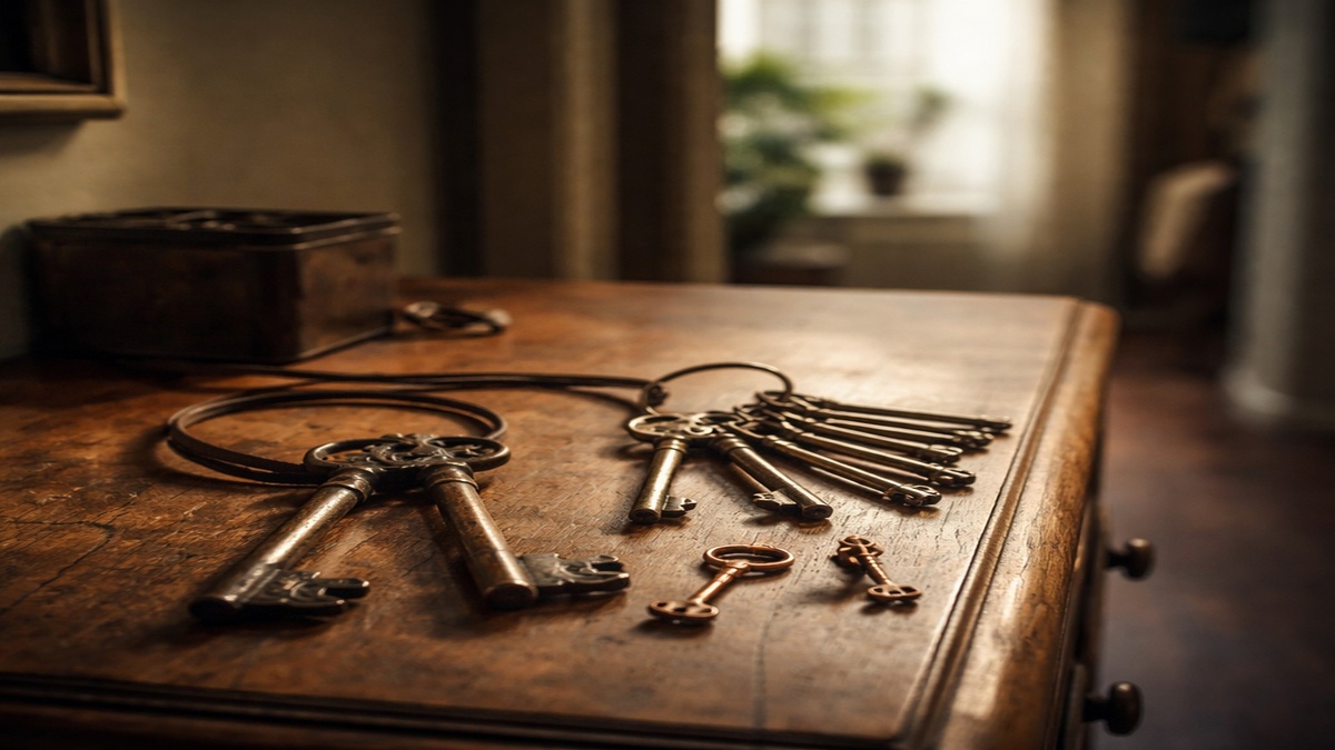 Она смотрела на ключи. Они лежали на тумбочке — два старых, семь на кольце, два медных. Все одиннадцать. В утреннем свете они поблёскивали тускло, будто подмигивали.