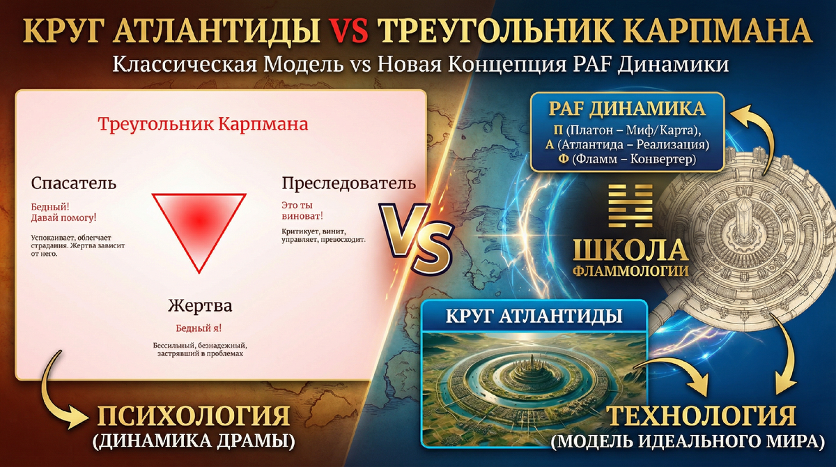 В статье проводится сравнительный анализ классической модели драматического треугольника Карпмана и новой концепции «Круга Атлантиды», разработанной в рамках PAF-динамики цивилизаций (Plato—Atlantis—Flamm). Показано, что треугольник Карпмана описывает локальные психологические роли, тогда как Круг Атлантиды представляет собой универсальный оператор смены режимов реальности, применимый от индивидуальной психологии до цивилизационных процессов. Предложена интеграция обеих моделей через четырёхвершинную структуру драматического квадрата и циклическую динамику архетипов.