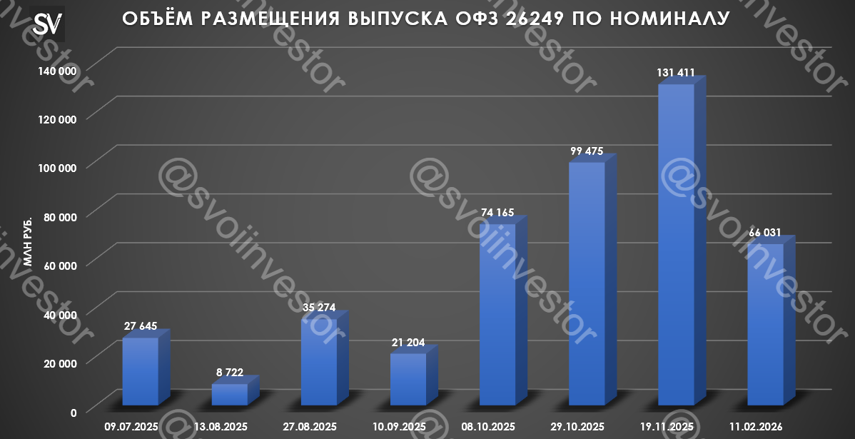 Минфин провёл аукцион ОФЗ, предложив инвесторам два выпуска. При его проведении индекс RGBI находился ниже 116 пунктов, с учётом снижения ставки и переговорного трека индекс повысился до 117,4 пунктов: 🔔 По данным Росстата, за период с 3 по 9 февраля ИПЦ составил 0,13% (прошлые недели — 0,20%, 0,19%), с начала месяца 0,20%, с начала года — 2,24% (годовая — 6,36%). Недельные темпы февраля замедлились относительно прошлых недель (прошлогодние недельки: 2025 г. — 0,23%, 2024 г. — 0,21%), конечно, это вдохновляет инвесторов, но я был бы осторожен с суждениями, потому что плодоовощная корзина дорожает, как и топливо, а крепкий рубль не останавливает рост цен на технику. Благоприятно на эту неделю повлияло снижении индексов цен на поездки на Черноморское побережье (-5,51%), если бы не такой обвал, мы бы увидели почти такую же динамику, как неделей ранее. 🔔 В 2026 г. Минфин планирует разместить в ОФЗ 6,5 трлн ₽ (в иностранной валюте в объёме, эквивалентном не более 1$ млрд, проинфляционный