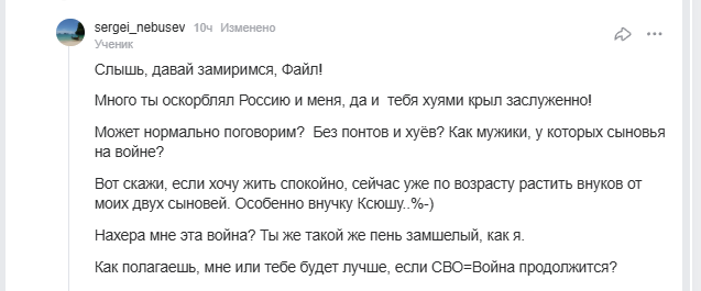 "Мириться" мы с тобой НИКОГДА не будем. Потому что твои сыновья воюют против МОЕЙ страны! ОНИ пришли войной в МОЙ дом, а не я в ВАШ! И "мириться" ты хочешь лишь по той причине, что не смогли как планировали захватить Украину силой- теперь хотите взять ее "мирно"- хитростью и подлостью, подкупом политиков... "Мир" в вашем понимании- это капитуляция Украины, добровольное выполнение Украиной всего того, чего вы не добились силой... Если бы кремль смог реализовать свои планы- ты бы сейчас ноги об меня вытирал, а твои сыновья жили бы в моем доме и орали, что "это всё исконно наше, русское и никогда Украины тут никогда не было!"