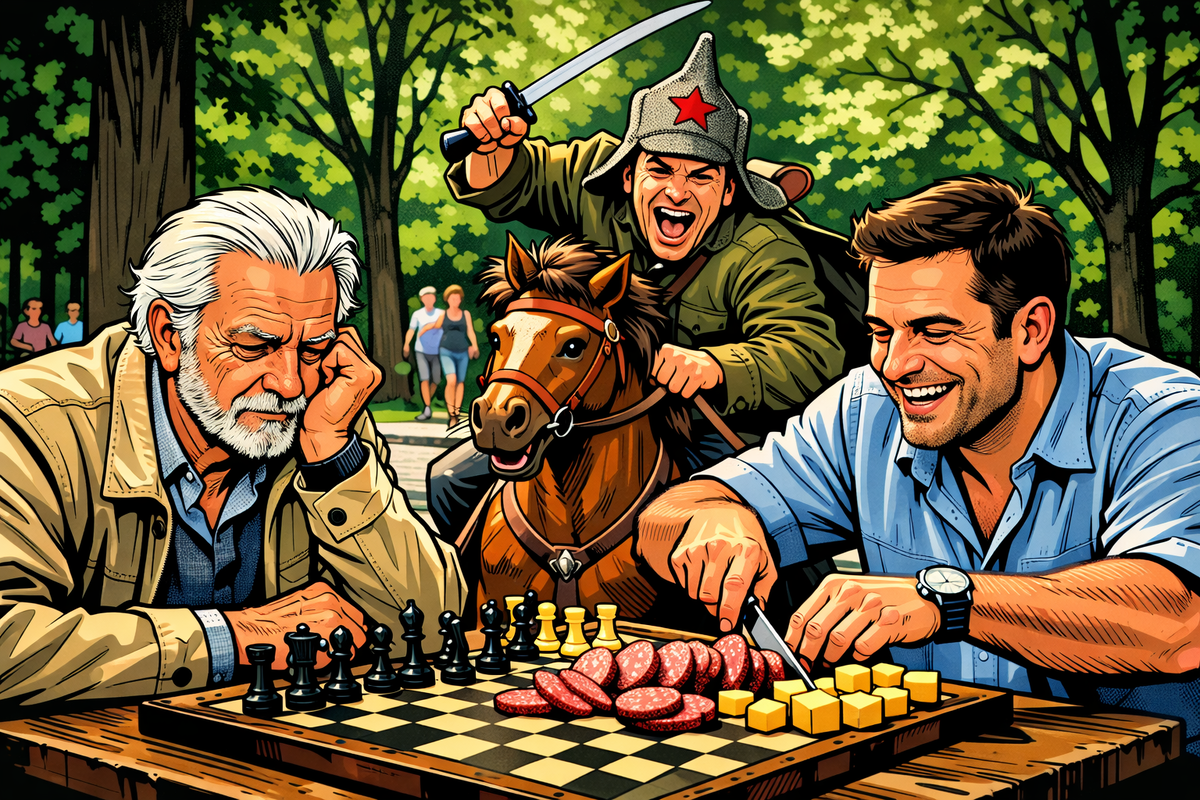 Наконец, откуда ни возьмись, появляется третий участник драмы — ему срочно нужны разделочная доска, чтобы порезать колбасу. Разумеется, ничего лучшего, чем шахматная доска в парке не найти! И вот он уже неистово кромсает свою жертву на бутерброды, вообще не обращая внимания на какие-то там фигуры.