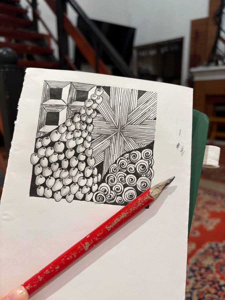 Мой первый зентангл готов ✅ Долго собиралась, думала, надо купить все специальное, в итоге просто взяла и сделала подручными средствами. Получилось слабовато, но я рада, что не стала чего-то ждать. 🖊️ Подумала, кстати, что подобными элементами можно в ежедневнике записи оформлять.