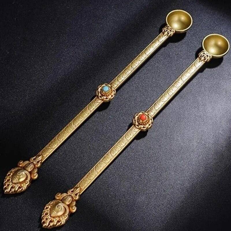 ЛОЖКИ МЕНРАК Данные ложки используются для совершения внутренних подношений амриты и ракты в ритуальной практике тибетского буддизма и бона. Всего существует восемь видов этих ложек, каждый из которых соответствует определенному виду подношения, а также типу совершаемой активности. В буддийской практике существуют четыре типа активности: умиротворяющая, приумножающая, подчиняющая и гневная. А каждая активность содержит в себе два подношения: амриты и ракты. Поэтому каждой активности и каждому подношению соответствует менрак строго определенной формы и определенного цвета, который отображается в виде полудрагоценного камня, украшающего рукоятку менрак. Все ложки с синим камням предназначены для подношения амриты, а с красным — для ракты. Формы ложек согласно типам активностей: 🔘Круглая форма — умиротворяющая активность. 🔺Треугольная форма — гневная активность. 🌙Форма полумесяца — преумножающая активность. ◼️Квадратная форма — подчиняющая активность, для ракты. Формы ложек сог