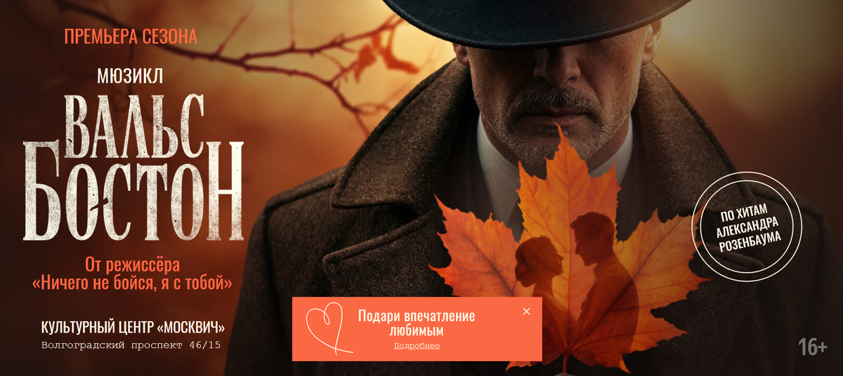 Шикарный мюзикл. Песни Александра Розенбаума обрели новое звучание и стали живыми страницами сюжета. Промокод: VDVOEM действует при покупке 2х билетов на мероприятия с 19 до 23 февраля. Промокод действует до 15.02