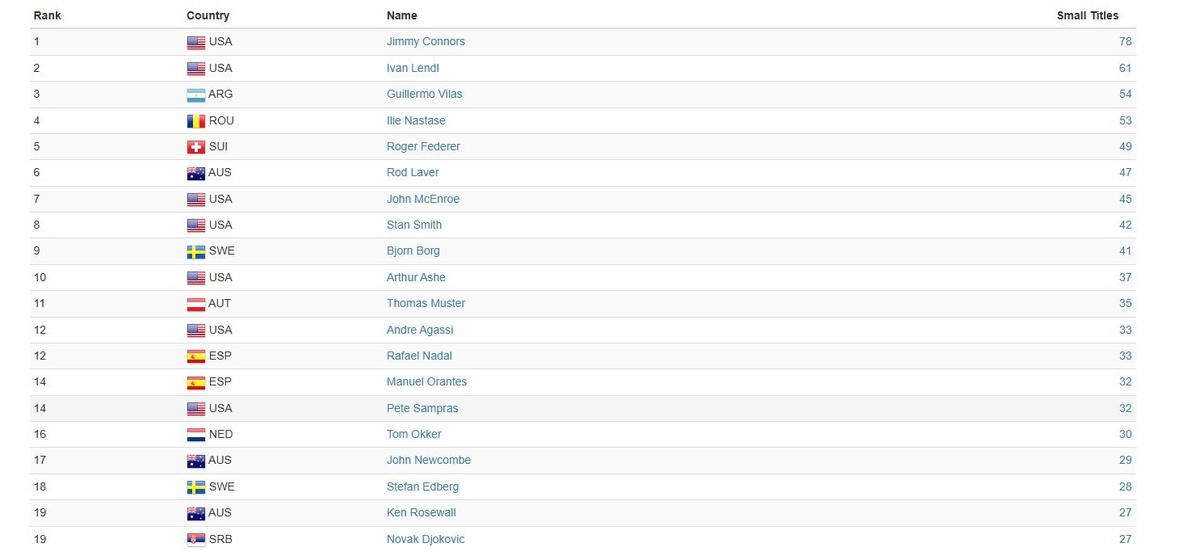 ): 🥇 Джимми Коннорс - 78 🥈 Иван Лендл - 61 🥉 Гильермо Вилас - 54 Илие Настасе - 53 Роджер Федерер - 49 Род Лейвер - 47 Джон Макенрой - 45 Стэн Смит - 42 Бьорн Борг - 41 Артур Эш - 37 Томас Мустер - 35 Андре Агасси - 33 Рафаэль Надаль - 33 Мануэль Орантес - 32 Пит Сампрас - 32 Том Оккер - 30 Джон Ньюкомб - 29 Стефан Эдберг - 28 Кен Розуолл - 27 Новак Джокович - 27 Подпишись на Эйс и точка