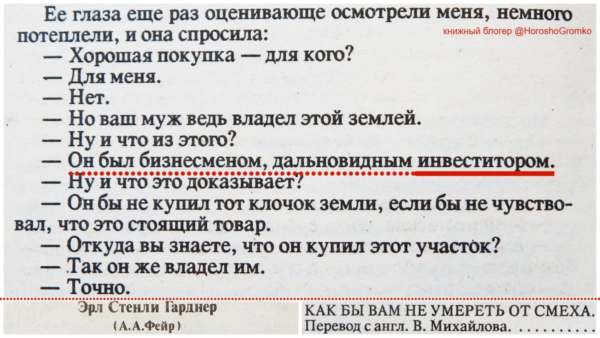 Читаю детектив Эрла Стенли Гарднера «Как бы вам не умереть от смеха», никого не трогаю, и вижу: «Как бы вам не умереть от смеха» - роман 1957 г. из знаменитого Гарднеровского цикла по детективное агентство Берты Кул и Дональда Лэма. Берта и Дональд получают заказ найти некую миссис Велс. У миссис Велс был состоятельный дядюшка, который недавно скончался, в завещании отписал племяннице земельный участок, и теперь её надо отыскать. Дональд приступает к поискам, но дело не так просто, как кажется. Мистер Велс двоежёнец, миссис Велс существует как минимум в двух экземплярах, к тому же непонятно, жива ли она вообще. С участком тоже мутно, то ли это бесполезный пустырь, который не стоит и гроша, то ли пустырь там только на поверхности, а внутри куча полезных ископаемых. Дональд отправляется к вдове покойного дядюшки, чтобы выяснить настоящую ценность участка. Вдова не колется, Лэм на неё давит. Говорит, что не просто так же дядя его приобрёл. В конце концов, он был бизнесменом, дальновидным