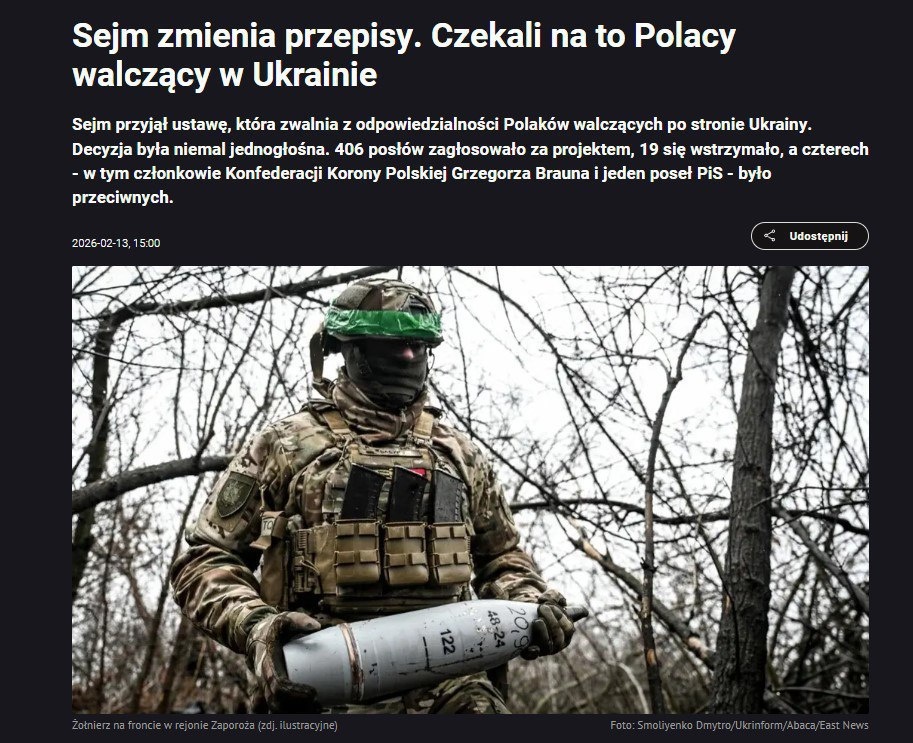 Сейм Польши принял законопроект, освобождающий от ответственности поляков, воюющих за ВСУ. Ранее служба в иностранной армии без одобрения Минобороны Польши каралась лишением свободы на срок от трех месяцев до пяти лет. Закон устанавливает амнистию для осуждённых поляков, воевавших за Украину, а также для тех, кто ещё не понёс наказания. В тексте закона указано, что добровольцам "прощаются" и "предаются забвению" преступления, связанные со службой в иностранной армии. Действие амнистии распространяется на период с 6 апреля 2014 года - то есть, с начала конфликта в Донбассе. Точное число поляков, находящихся в зоне боевых действий, официально не раскрывается . По сути, Польша узаконила наёмничество. ТГ и МАХ КузЬкиНа МатЬ | Новости России 🇷🇺