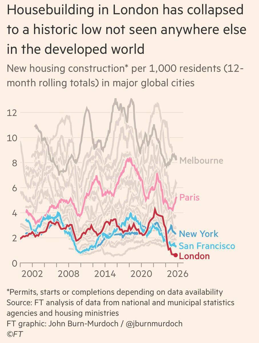 Несмотря на жилищный кризис, объём жилищного строительства в Лондоне упал до исторически низкого уровня, невиданного нигде в развитых