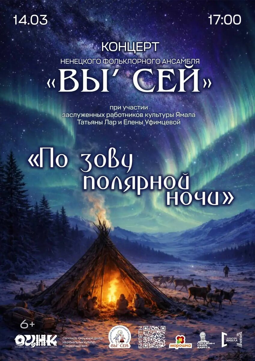 🏔️❄️ 14 марта в 17:00 Окружной Центр национальных культур приглашает вас на встречу с удивительным миром ненецкой культуры. Фольклорный ансамбль «Вы’ сей» подарит вам вечер, наполненный древними песнопениями и танцами Ямальской земли. В программе участвуют Заслуженные работники культуры ЯНАО Татьяна Лар, Елена Уфимцева, а также Нядма и Масне Няруй. Позвольте голосу тундры коснуться вашего сердца! Билеты здесь и доступны по Пушкинской карте или через сервис «Морошка» со скидкой 20% 🌞 #ОЦНК #ЯНАО #КультураЯмала #ВыСей #Ненцы #Салехард 👍 в ВК | MAX