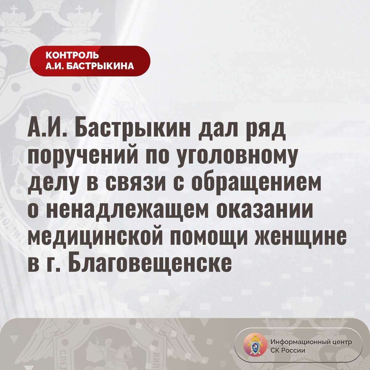 А.И. Бастрыкин дал ряд поручений по уголовному делу в связи с обращением о ненадлежащем оказании медицинской помощи женщине в г. Благовещенске