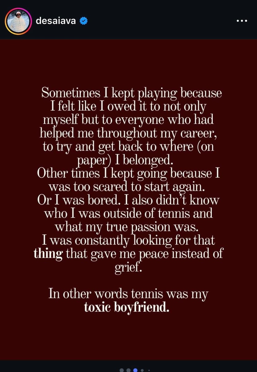 В своём заявлении она рассказала о токсичности в теннисе и ставках на спорт: 💬 «Хочу сказать огромное спасибо всем в теннисном сообществе, кто когда-либо заставлял меня чувствовать себя неполноценной. Идите на хрен все игроки, кто присылал мне ненависть или угрозы смерти. Идите на хрен люди, которые сидят за экранами в социальных сетях, комментируя моё тело, мою карьеру или что-то ещё, к чему они хотят придраться. И пошёл на хрен спорт, который прячется за так называемым классом и джентльменскими ценностями. За белыми нарядами и традициями скрывается культура, которая является расистской, женоненавистнической, гомофобной и враждебной ко всем, кто не вписывается в её рамки». Подпишись на Эйс и точка