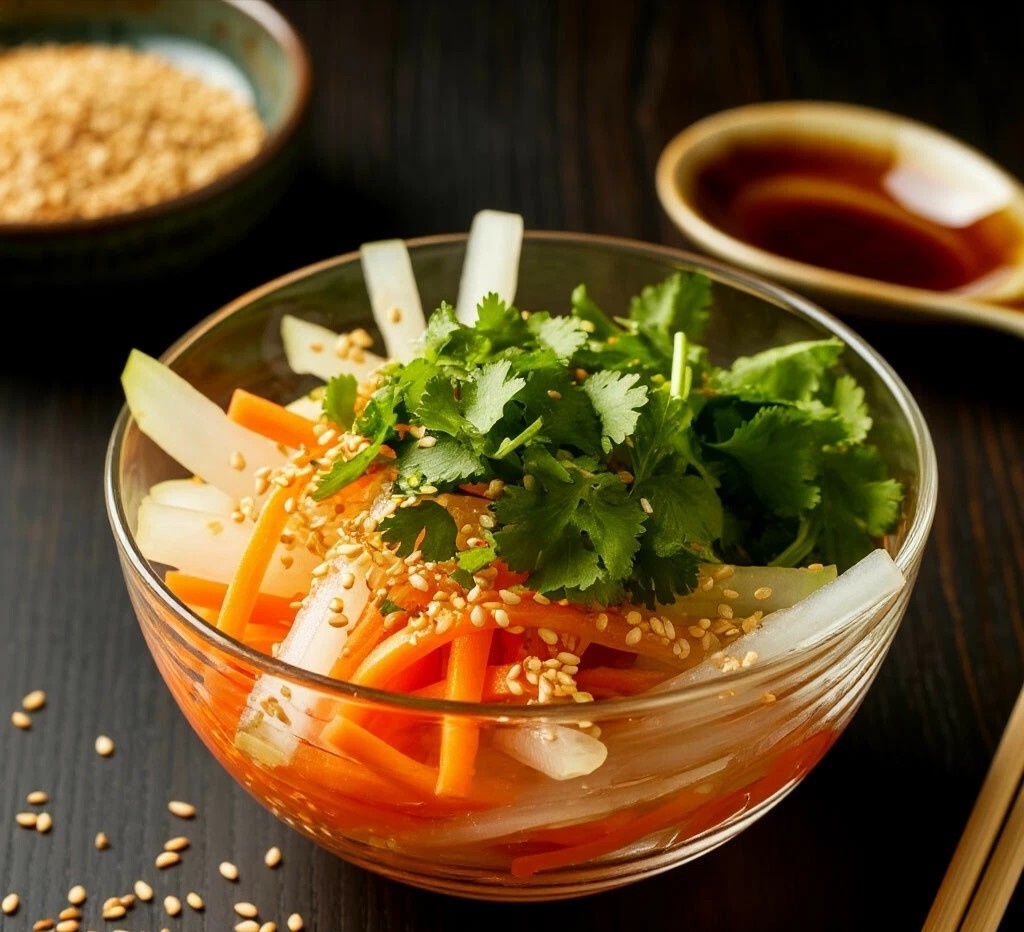 Мяу, мои любители хруста и свежести! 😼🥕 Этот салат — настоящая азиатская зарядка для вкусовых рецепторов. Дайкон хрустит, морковь добавляет сладости, чеснок — пикантности, а кунжут и кинза — волшебного аромата. Готовится быстрее, чем кот намывает мордочку!