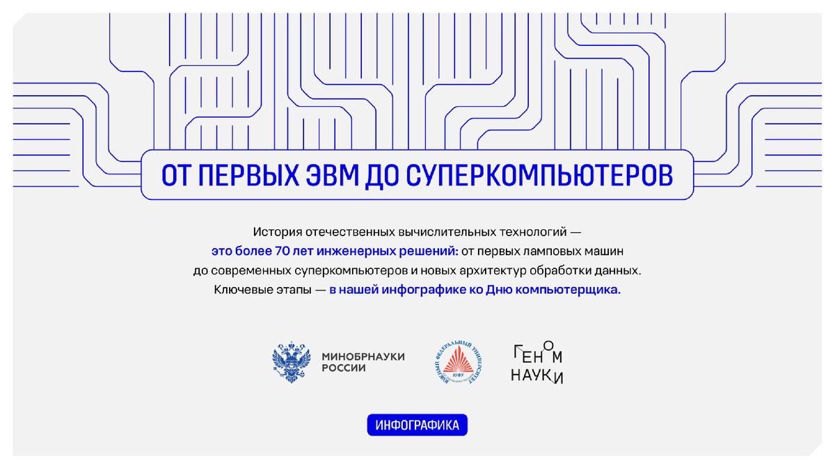 Как менялись технологии, которые сегодня определяют цифровое развитие страны? Ко Дню компьютерщика в России совместно с ЮФУ собрали ключевые этапы развития отечественных вычислительных решений — от первых инженерных экспериментов до масштабных систем обработки данных. В инфографике — факты, цифры и имена, сформировавшие отрасль. Материал подготовлен совместно с проектом "Геном науки".